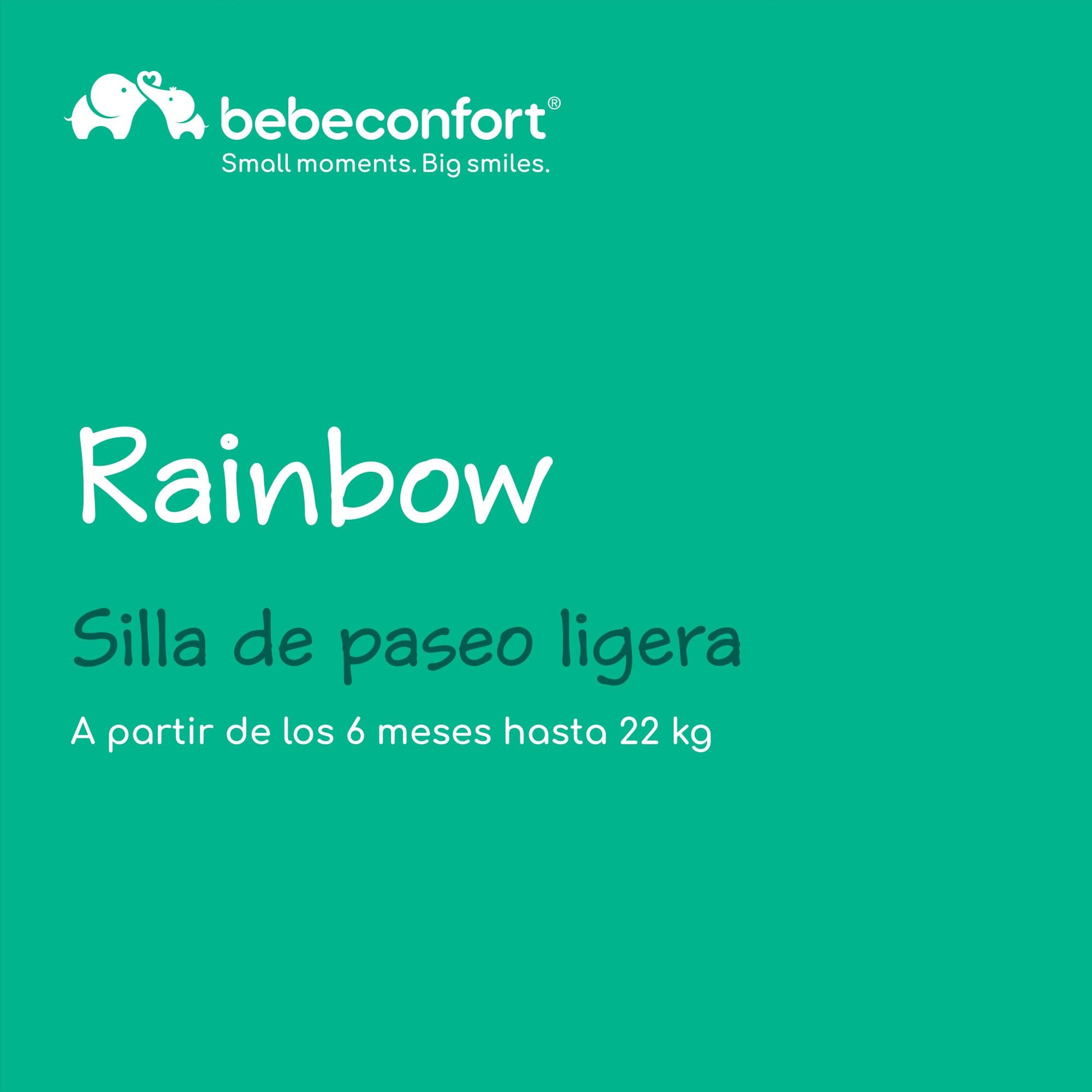 Detalles: El cochecito multifuncional Rainbow es adecuado para niños de 6 meses a 4 años (22 kg). Gracias a su asiento acolchado, proporciona a tu hijo comodidad e incluso durante los viajes largos, tu hijo estará bien sujeto con el amplio asiento acolchado y no debería sentir ninguna molestia. El respaldo del cochecito y su reposapiés se pueden ajustar según los deseos de tu hijo para tener una posicion cómoda.Cuando no estés usando la silla para pasear con tu hijo, puedes plegarla fácil y rápidamente también. El cochecito tiene un tamaño pequeño cuando está plegado y queda bloqueado automáticamente, así se puede guardarse a un modo compacto. El cochecito solo pesa 6.6 kg, lo que lo hace adecuado para viajar.